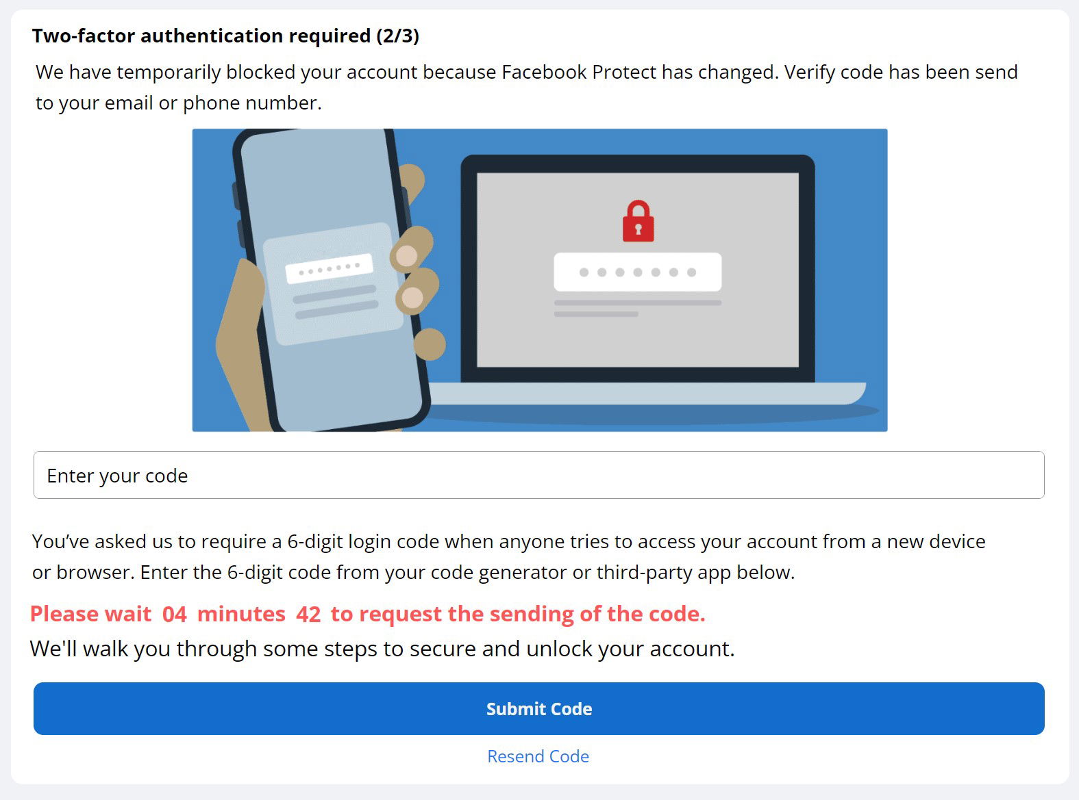 Ci viene detto che dobbiamo inserire il codice di sicurezza per l’autenticazione a due fattori, autenticazione però che non stiamo realmente facendo noi: sono i truffatori che stanno inserendo i nostri dati e che faranno sì che Facebook ci invii il codice che loro ci chiedono di inserire in quella pagina. Se comunichiamo tale codice il gioco è fatto, abbiamo appena regalato a un truffatore il nostro account Facebook, che potrebbe limitarsi a un profilo personale, ma molto facilmente è anche collegato a una pagina, a un gruppo, magari a un Business manager; perderemo quindi sia il nostro profilo personale che l’accesso a ciò che è controllato da quell’account.