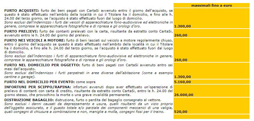 Ad esempio questa era un’elenco di massimali assicurativi di coperture con CartaSì: