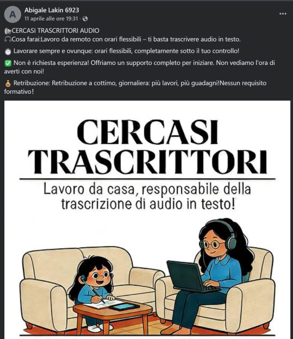 🎧 CERCASI TRASCRITTORI AUDIO 🎧 Cosa farai: Lavoro da remoto con orari flessibili – ti basta trascrivere audio in testo. 📱 Lavora sempre e ovunque: orari flessibili, completamente sotto il tuo controllo! ✅ Non è richiesta esperienza! Offriamo un supporto completo per iniziare. Non vediamo l’ora di averti con noi. 💰 Retribuzione: Retribuzione a cottimo, giornaliera: più lavori, più guadagni! Nessun requisito formativo!