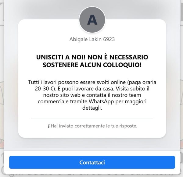 Peccato che si tratti per l’appunto della classica truffa del lavoro online, in cui si offre un’opportunità apparentemente semplice e ben retribuita per attirare le vittime in una rete di inganni. Il meccanismo è sempre lo stesso: si parte da un’offerta allettante (trascrizione audio, promozione su Instagram, like su TikTok, poco cambia), si traferisce la conversazione su canali sempre meno tracciabili (Facebook → WhatsApp → Telegram), si raccolgono dati personali e alla fine si chiede alla vittima di anticipare denaro per “sbloccare” i guadagni promessi.