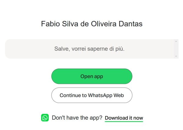 Comunque se clicchiamo su Contattaci arriviamo alla classica schermata per aprire WhatsApp (se già non siamo da telefonino con l’app installata):