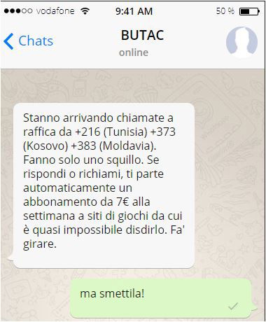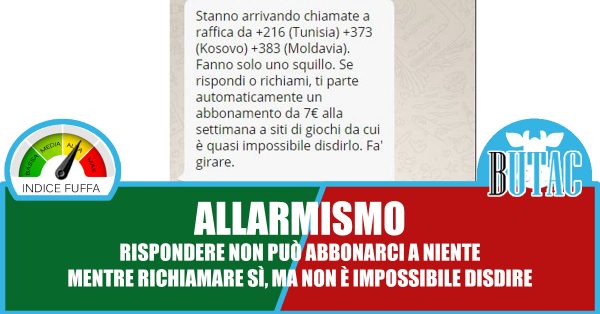 Stanno arrivando chiamate a raffica da +216 (Tunisia) +373 (Kosovo) +383 (Moldavia). Fanno solo uno squillo. Se rispondi o richiami, ti parte automaticamente un abbonamento da 7€ alla settimana a siti di giochi da cui è quasi impossibile disdirlo. Fa’ girare.
