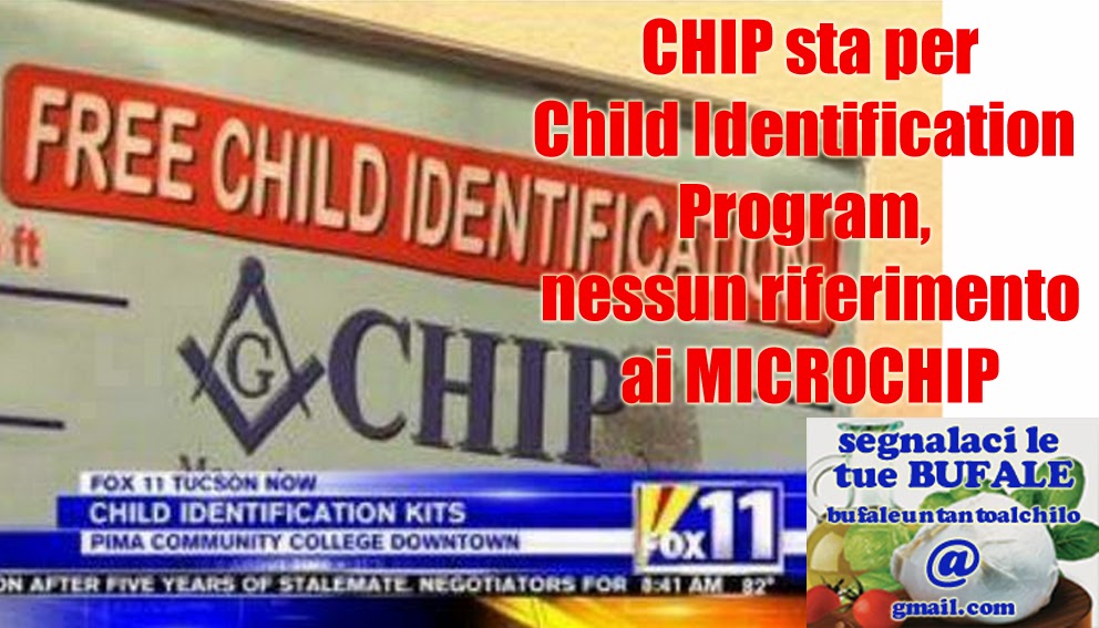 Perché è bufala? Perché il Child Identification Program è un’iniziativa lanciata da alcune logge massoniche (fenomeno negli States è molto più consolidato e alla luce del sole che da noi, diciamo più dei Lions/Rotary Club che vere massonerie), ma anche da scuole pubbliche e private. In cosa consiste il Chip? Di solito si tratta di un supporto video (dvd, flashkey, hard disk) che contiene un filmato del proprio figlio, una foto recente, le impronte digitali, le impronte dentali e i referti medici…