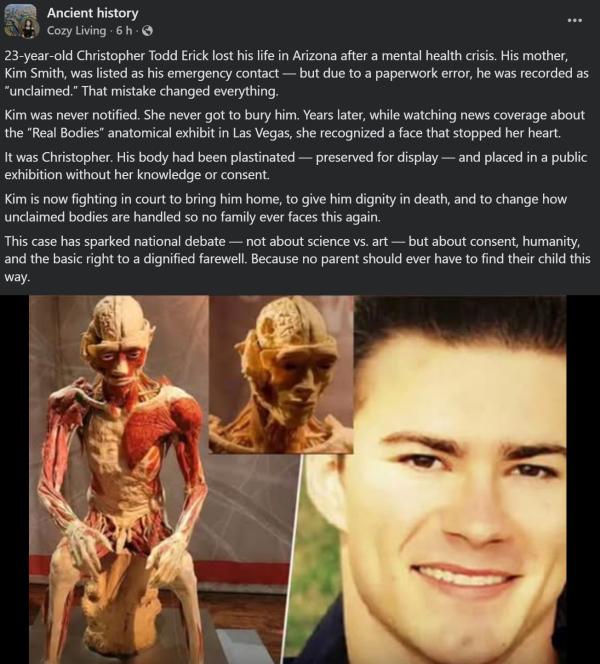 Che tradotto in italiano riporta: Christopher Todd Erick, 23 anni, ha perso la vita in Arizona dopo una crisi di salute mentale. Sua madre, Kim Smith, era indicata come contatto di emergenza, ma a causa di un errore burocratico, è stato registrato come “non reclamato”. Quell’errore ha cambiato tutto. Kim non ne fu mai informata. Non riuscì mai a seppellirlo. Anni dopo, mentre guardava il servizio giornalistico sulla mostra anatomica “Real Bodies” a Las Vegas, riconobbe un volto che le fece fermare il cuore. Era Christopher. Il suo corpo era stato plastinato, cioè conservato per essere esposto, e messo in mostra al pubblico senza che lei ne fosse a conoscenza o avesse dato il suo consenso. Kim ora sta lottando in tribunale per riportarlo a casa, per dargli dignità nella morte e per cambiare il modo in cui vengono gestiti i corpi non reclamati, in modo che nessuna famiglia debba mai più affrontare una situazione simile. Questo caso ha scatenato un dibattito nazionale – non sulla scienza contro l’arte – ma sul consenso, sull’umanità e sul diritto fondamentale a un addio dignitoso. Perché nessun genitore dovrebbe mai ritrovare il proprio figlio in questo modo.