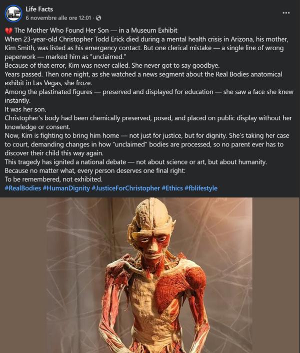 L’unico elemento reale dietro la versione che vediamo diffondere sui social è che Kim Smith, anni dopo, ha dichiarato su Facebook di credere che il corpo del figlio non sia stato cremato come previsto, ma venduto illegalmente e finito nella mostra anatomica Real Bodies at Bally’s. È una convinzione personale, non un fatto verificato. Nessun test del DNA, nessuna prova forense, nessun atto giudiziario la conferma.