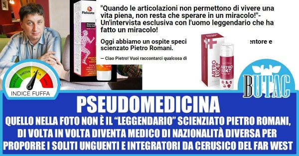Il signore nella foto qui sopra non è Pietro Romani, potrebbe essere un Dr. Dušanić, ma anche un Dr. Pedro Serrano Vidal. Non è un signore nato e cresciuto a Imola nel 1975. Probabilmente non è nemmeno un medico. Anzi, probabilmente non ha la più pallida idea che le sue foto vengano usate in giro per il mondo per pubblicizzare prodotti fuffa di nessuna utilità.