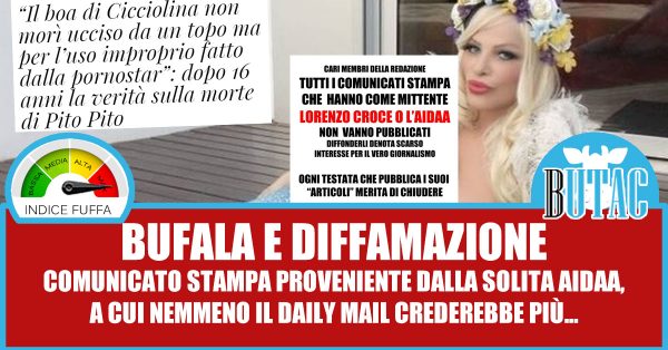 Fonte della notizia? Lorenzo Croce, presidente della solita AIDAA. Chi legge BUTAC da tempo sa perfettamente che i comunicati stampa di Lorenzo Croce sono fuffa, inviata alle redazioni dei giornali di tutto il Paese, e fatta rigirare per generare visibilità su soggetto e associazione.