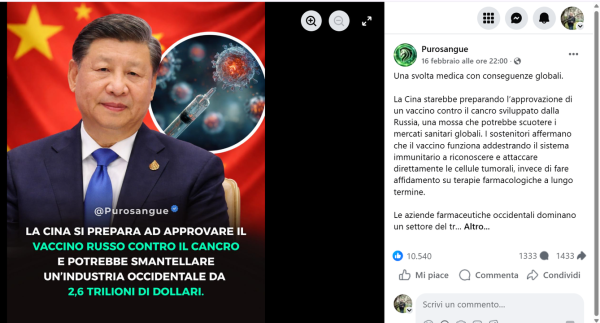 Il post, al momento in cui scriviamo, ha oltre 12mila interazioni, ma è un classico post emozionale, fatto non per informare ma solo per parlare alle pance dei propri follower. Non viene portata nessuna fonte, nessun dato; solo un comunicato, scritto probabilmente con IA e calibrato per raggiungere il pubblico di riferimento. Sia chiaro, non sarebbe affatto una novità: sono anni che si sta studiando un vaccino contro “il cancro” (se così si può chiamare), e sono già stati presentati risultati promettenti. Fa sorridere che nel testo si parli di “addestrare il sistema immunitario” come se fosse una novità, quando è la base su cui i vaccini operano. Nessuna rivoluzione, nessuna nuova scoperta.