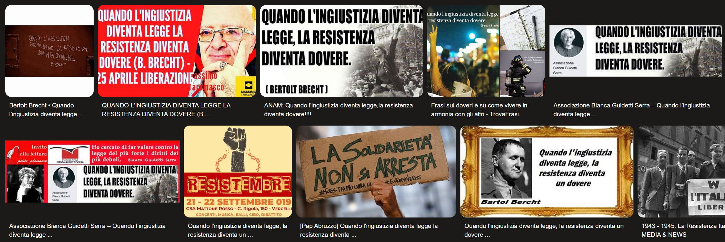Ma la cosa che a noi ha fatto più sorridere è che la frase è stata ribaltata da Fusillo: nella versione originale infatti non è la legge a diventare ingiustizia, bensì l’ingiustizia a diventare legge. E non è finita qui, perché la versione usata da Fusillo, se la cercate, la trovate riportata col testo corretto quasi ovunque, ma attribuita a Bertold Brecht.