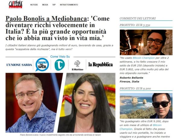 Della notizia lanciata nel box pubblicitario di prima non si trova traccia. Perché siamo di fornte alla solita truffa che ha cambiato ancora una volta nome. Un tempo era Bitcoin Code, poi Evolution, poi Billionaire, e ora siamo a Bitcoin Champion. Ma come dimostrano le varie pagine sfruttate per diffondere la truffa è chiaro che i soggetti (criminali che meritano la galera) dietro ai marchi sono sempre gli stessi.