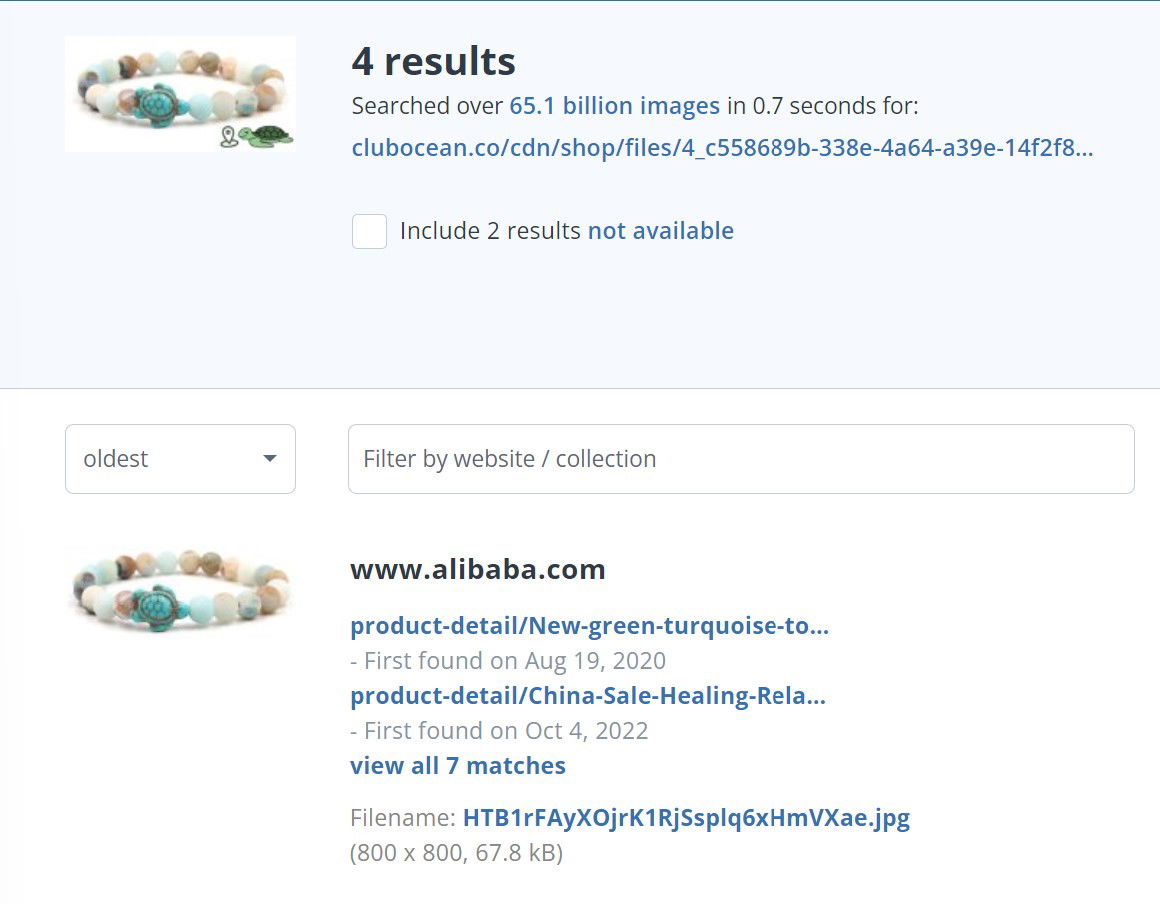Quindi non si tratta di nostre supposizioni, Alibaba vendeva braccialetti identici ben prima di Club Ocean, e il fatto che Club Ocean usi sul suo sito foto che per la prima volta sono state pubblicate su Alibaba è segno che i braccialetti sono esattamente gli stessi, acquistati in dropshipping e rivenduti a cifre di gran lunga superiori del loro costo di vendita sui siti cinesi. Lo stesso giochino di verifica lo potremmo fare con altre immagini sul loro sito, ma sarebbe una perdita di tempo. Vi invitiamo, se volete, a farlo voi usando TinEye, è una buona occasione per imparare a usare uno strumentino agile ma sempre utile per chi fa abitualmente acquisti online.