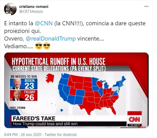 Per chi facesse fatica a leggerlo è uno screenshot di un programma della CNN, Fareed’s Take, screenshot che mostra la mappa degli States e sembra dare per vincente Trump con 26 Stati in suo favore, contro 23 per Biden. Il post, pubblicato il 28 novembre 2020 a firma Cristiano Romani, riporta: