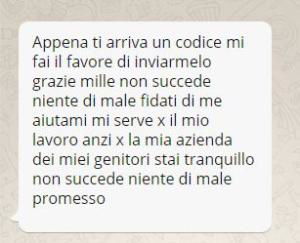 Appena ti arriva un codice mi fai il favore di inviarmelo grazie mille non succede niente di male fidati di me aiutami mi serve x il mio lavoro anzi x la mia azienda dei miei genitori stai tranquillo non succede niente di male promesso
