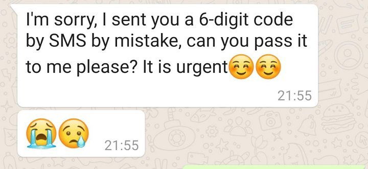 I’m sorry, I sent you a 6-digit code by SMS by mistake, can you pass it to me please? It is urgent