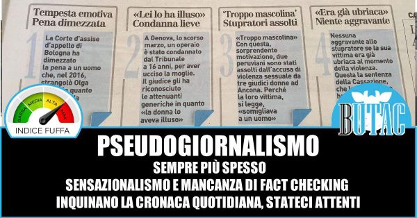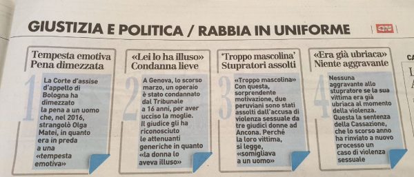 Venerdì scorso ero al bar che bevevo il mio caffè e sfogliavo l’unico giornale sempre presente nei bar di Bologna: Il Resto del Carlino. Nello sfogliarlo a un certo punto una pagina ha attratto la mia attenzione, si parlava di sentenze di Tribunale, di leggerezza dei magistrati. Non è importante quale fosse la notizia principale, quello che ha attirato la mia attenzione era la parte in alto della pagina, dove venivano riportati casi in cui, secondo la Redazione, la Magistratura si era comportata in maniera discutibile.