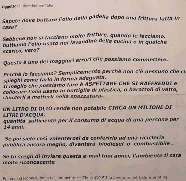 Insomma, buttare via l’olio è una cosa che va fatta con criterio. Ma non bisogna seguire ciecamente i suggerimenti dell’ennesimo posterino che vedete circolare in rete. Fidarsi di messaggi come quello qui sopra può portarci a fare cose illegali (come sarebbe il gettare via l’olio nella spazzatura generica in un barattolo).