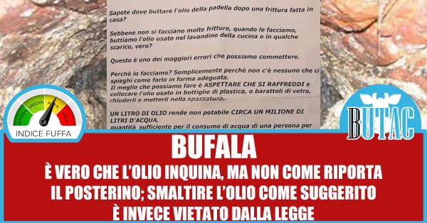 Prima di tutto va specificato che buttare l’olio come sostengono nel posterino che circola è vietato dalla legge, come spiega La Legge per Tutti: