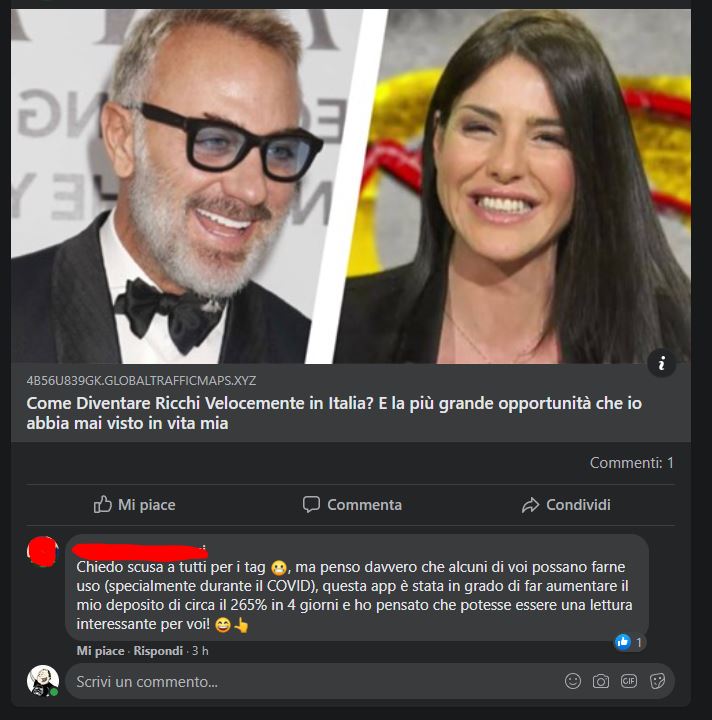 Il link 4b56u839gk. globaltrafficmaps. xyz (dominio con un giorno di vita) fa un redirect a un altro dominio fuffa (home. blandspipers. com) senza che ci sia realmente un sito web, ma solo un tool malware che genera post come quello sopra, e infetta il vostro pc. Ovviamente se avete un sistema antivirus decente lui si accorge di tutto ciò e blocca il link. Se questo non accade purtroppo 90 dei vostri contatti si troveranno taggati su un post simile, e voi sarete finiti probabilmente su pagine collegate ai soliti BitCoin Evolution o come cacchio si chiamano oggi. Truffe a non finire, a cui stare attenti, e magari tenete presente l’acquisto di un antivirus migliore.
