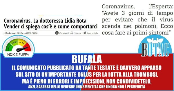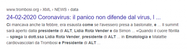 La premessa e la chiusa fanno precisi riferimenti a un medico italiano, la dottoressa Lidia Rota Vender, e all’associazione che presiede, una Onlus dedicata alla lotta alla trombosi. Molti me l’hanno segnalato convinti che fossero aggiunte fasulle per rendere il comunicato più credibile. Purtroppo non è così, ALT ha davvero pubblicato quel comunicato sul proprio sito, all’interno delle news. Stamattina (3 marzo 2020) era online esattamente come ve l’ho riportato qui sopra, pubblicato sul loro sito ufficiale tra le news. Ora è stato rimosso, senza però che sia stata pubblicata alcuna smentita.