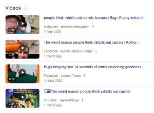 Questa qui sopra risale addirittura al 1890. Esiste un altro sistema per cercare se la locuzione “rabbit eating carrots” esistesse prima del 1940, ed è newspapers.com che – seppur basandosi solo su testate americane – dato un determinato periodo di tempo cerca se quelle parole siano apparse sui quotidiani. Se cerco la frase “rabbit eating carrots” tra il 1690 e il 1939 mi escono 180 risultati, ma non è finita qui: come qualcuno di voi sa mia moglie è inglese, ai nostri figli abbiamo letto una sana dose di storie di Peter Rabbit, di cui la prima a uscire è del 1901. Peter Rabbit non mangia propriamente carote nelle storie bensì radicchio, ma guardate come viene illustrata la cosa: