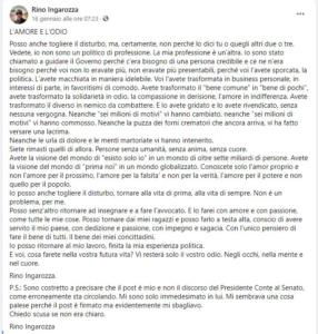 In data 16 gennaio, come fa notare NextQuotidiano, un utente Facebook ha pubblicato su un gruppo un monologo in cui si immedesima nei panni del presidente del Consiglio (ex? Dimissionario? Prossimo?) Giuseppe Conte che parla al Senato. Ma perché parlarne oggi che è il 26 gennaio? Perché negli ultimi giorni questo monologo è stato ripetutamente copiato e incollato su varie piattaforme da più utenti, che a dieci giorni dal post originale hanno deciso di riproporlo proprio nelle ore in cui Conte rassegna le dimissioni a Mattarella. Negli ultimi giorni il falso discorso di Conte ha girato talmente tanto sui social che il povero Rino, che ne è l’autore, ha aggiunto questo PS al suo post originale: