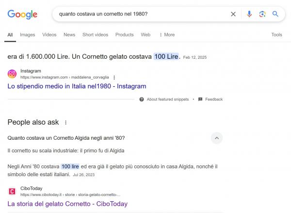 La confusione si crea grazie – purtroppo – al solito giornalismo italiano un tanto al chilo, perché se cerchiamo su google “quanto costava un cornetto nel 1980” il risultato di ricerca scelto anche da Google stessa per rispondere alla domanda è un articolo di CiboToday, firmato da Vivian Petrini, che senza alcuna fonte riporta: