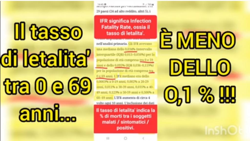 Il video ci spiega che tra gli 0 e i 69 anni il tasso di letalità è meno dello 0,1%, in realtà lo studio che linkano dice altro (ma rileva anche che la popolazione italiana ha risposto in maniera diversa delle altre allo studio, e che quindi i dati potrebbero esser falsati). Il video – che fino a questo punto era stato molto attento a snocciolare i numeri – smette di farlo, sta allo spettatore in teoria fare da solo i calcoli, ma chi ha avuto bisogno delle istruzioni ricevute fino a quel momento non credo sia così avvezzo a farli, vede uno 0,1% e pensa, beh sì, è un numero piccolo. E difatti il video subito dopo mostra questa schermata: