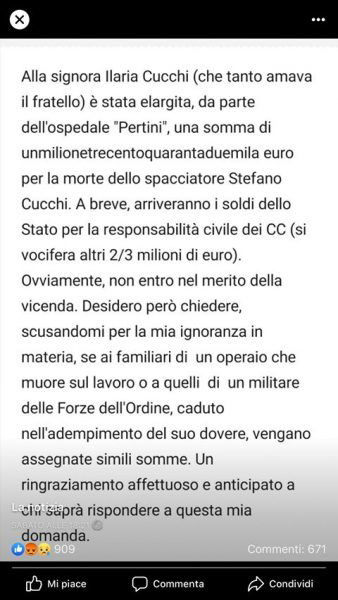 Alla signora Ilaria Cucchi (che tanto amava il fratello) è stata elargita, da parte dell’ospedale “Pertini”, una somma di un milionetrecentoquarantaduemila euro per la morte dello spacciatore Stefano Cucchi. A breve. arriveranno i soldi dello Stato per la responsabilità civile dei CC(si vocifera altri 2/3 milioni di euro). Ovviamente non entro nel merito della vicenda. Desidero però chiedere, scusandomi per la mia ignoranza in materia, se ai familiari di un operaio che muore sul lavoro o a quelli di un militare delle Forze dell’Ordine, caduto nell’adempimento del suo dovere vengano assegnate simili somme. Un ringraziamento affettuoso e anticipato a chi saprà rispondere a questa mia domanda.