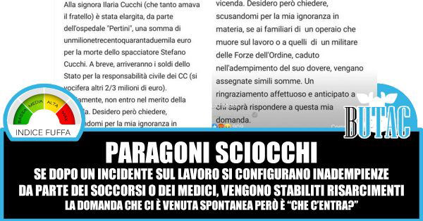 Partiamo dai toni del messaggio, melliflui mi verrebbe da definirli. Non è che ci sia molto da dire, il paragone è sciocco, su più livelli. Stefano Cucchi non è morto mentre al lavoro, ma è morto a causa delle percosse subite, e i medici sono risultati colpevoli di gravi negligenze per ritardi sia nella diagnosi, sia nelle cure. I risarcimenti sono dati perché ci sono state sentenze di tribunali, non perché si elargiscono soldi a caso. Chi muore sul lavoro, se lavoratore regolare, ha diritto a risarcimenti che si basano su contratto e assicurazioni del datore di lavoro. Qui la situazione è completamente diversa, abbiamo un cittadino italiano, che prima viene percosso in maniera brutale da chi invece dovrebbe difenderlo, e poi viene trattato in maniera insufficiente da chi dovrebbe curarlo.