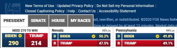 Sia chiaro, non sono un commentatore politico americano, ma mi fa strano che tanti di colpo abbiano iniziato a linkare quel sito internet abbandonando quasi totalmente le altre narrazioni. Sostenere che solo la CNN attribuisca la vittoria a Biden è una presa in giro.