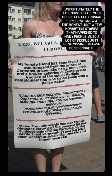 Pensa che tra il 9 (giorno delle elezioni) e il 12 agosto approssimativamente 7000 persone sono state picchiate e arrestate durante le manifestazioni (e voglio sottolineare come queste sono state e continuano ad essere assolutamente pacifiche). Un sedicenne è stato portato alla prigione di Okrestina già in stato comatoso per le percosse ricevute (allego qui un link ad un articolo dove ne parlano in modo piú appropriato anche se le immagini sono autoesplicative, sebbene non siamo le piú cruente disponibili https://news.tut.by/society/696741.html?tg ).