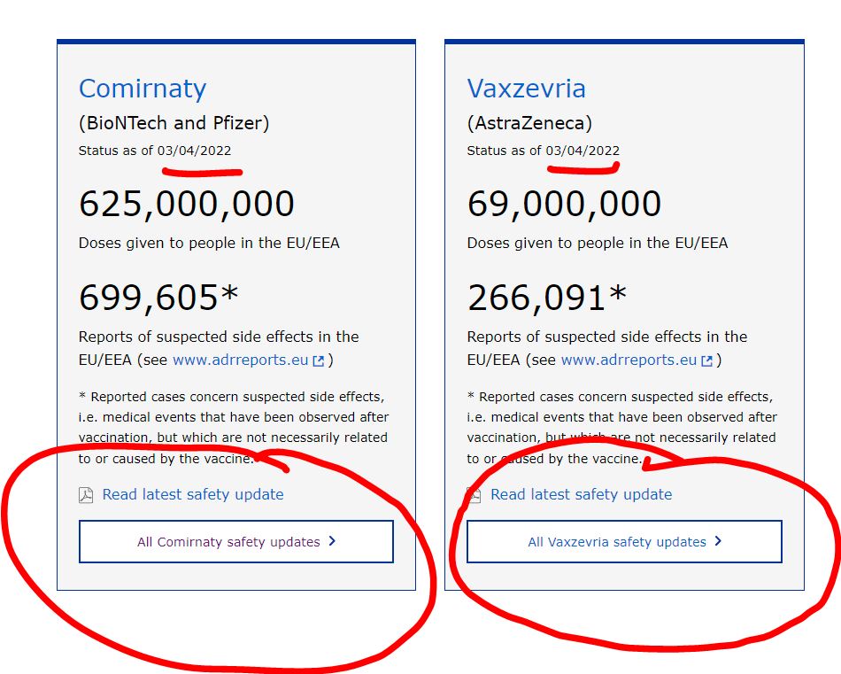 Già da questa discrepanza tra AIFA ed EMA Crudelini avrebbe dovuto cogliere che c’è qualcosa che non torna in quanto sta riportando ai suoi fidati lettori. In questa pagina dell’EMA trovate tutti gli aggiornamenti sui vaccini contro la COVID-19, e leggendo la pagina con attenzione ci si accorge che l’ultimo report sulla sicurezza dei vaccini è del 13 aprile 2022, e prima c’era il 17 marzo 2022, il 17 febbraio 2022, e così via fino appunto ad arrivare a quello del 29 gennaio 2021. Nella pagina i dati sono aggregati per tipo di vaccino, ma poi se si vuole si possono trovare (per ogni vaccino) i rapporti sugli aggiornamenti relativi alla sicurezza degli stessi suddivisi mese per mese. Qui ad esempio potete vedere i rapporti su Comirnaty a partire da quel primo rapporto di gennaio 2021.