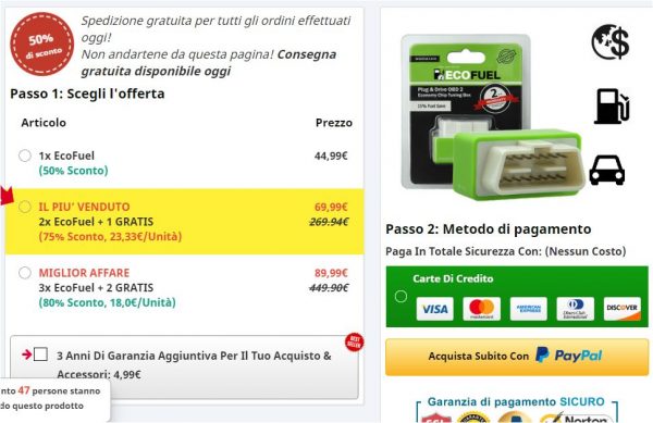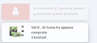 Nel mentre ero sul sito un pop-up mi avvertiva di quanti EcoFuel venissero venduti durante la mia visita. Messaggini acchiappaclienti compaiono costantemente nel pop-up, mi raccontano di quanto velocemente il prodotto vada esaurito. Tutta psicologia per indurmi a comperarlo.