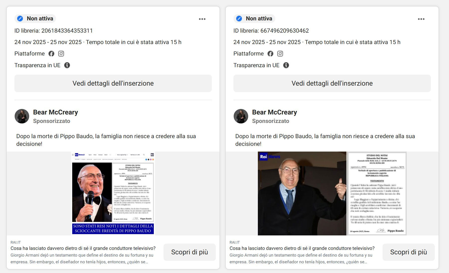 Post che fanno le solite cose: ci rimandano a finte testate giornalistiche dove vengono raccontate bufale varie sul testamento di Baudo, bufale che servono a convincerci che esistono sistemi per guadagnare moltissimi soldi a partire dal solito minuscolo investimento di 250 euro. Nulla che non abbiamo già visto, ma ripetiamo, il fatto che questi post continuino ad apparire è la dimostrazione pratica che chi li diffonde viene premiato, e quindi che esiste un numero non minuscolo di soggetti che continua a cascarci. Purtroppo è impossibile valutare quanti vengano raggirati ogni volta; quello che possiamo ribadire è che – pochi o tanti che siano – tutti dovrebbero fare causa prima di tutto a Meta che permette la circolazione di questi messaggi. Gli algoritmi dovrebbero essere in grado di rendersi conto subito e in automatico che nella preview dell’annuncio di Baudo viene inserito l’url della Rai ma che in realtà il link porta a un altro indirizzo web. Già questo dovrebbe essere sufficiente a fare sì che l’inserzione venisse bloccata, e invece ciccia.