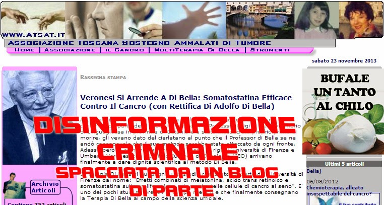 Ma è ovviamente FUFFA, FUFFA per uTonti che non ne capiscono di medicina e ricerca, FUFFA per idioti che invece che andare dal medico cercano le proprie cure online o su giornali che NULLA hanno a che spartire con la medicina stessa. Stavolta l’articoletto l’ho trovato linkato sul sito dei 5stelle di Nebrodi (che avevamo già visto disinformare anche riguardo a Stamina) e sul sito di un’associazione che si chiama: “Associazione Toscana Sostegno Ammalati di Tumore (A.T.S.A.T.)”…quello che ASTAT non dice chiaramente in prima pagina è che sono una ONLUS nata APPOSTA per supportare il metodo Di Bella, quindi (ovviamente) sono un po’ di parte. Dalla loro pagina info: