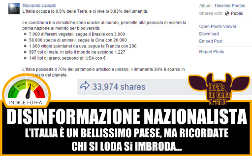 Io sono dell’idea che il nostro sia un bellissimo Paese, dalle tante caratteristiche uniche, ma questo non vuol dire che sia migliore di altri; partire da concetti come questo è sbagliato, si diventa nazionalisti ottusi che credono alle stesse panzane che inventano. È importante accorgersi che non siamo migliori di tanti altri posti al mondo, di bello c’è che siamo italiani, e all’estero ci amano molto per questo. Non siamo il Paese con la biodiversità maggiore al mondo, basta farsi un giretto qui per verificare quale sia la reale situazione, e accorgersi di quanto poco il post ci abbia preso; al massimo potremmo essere quelli che hanno più biodiversità in Europa, ma mancano le basi per affermarlo con certezza.