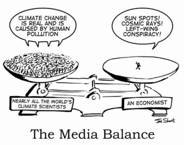 The Media Balance by Joe Short: a sinistra quasi tutti gli scienziati del clima del mondo che dicono che i cambiamenti climatici sono reali e causati dall’inquinamento umano, a destra un economista che dice che è colpa delle macchie solari, dei raggi cosmici e di un complotto della sinistra.