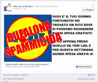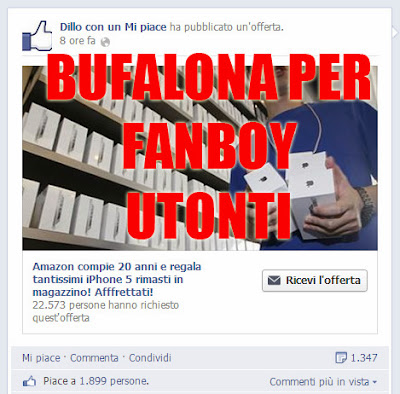 E bona, non è possibile che nel 2013 si cada ancora nella boiata del si regalano iPhone 5 o buoni acquisto…Ma evidentemente siamo i soli a pensarlo se la pagina che ne sta spacciando in questo momento ha più di UN MILIONE di Mi Piace, si si avete acpito bene 1,2 milioni di Mi Piace per una paginetta a volte anche divertente ma tra le principali fonti di SPAM sul Facebook italiano!