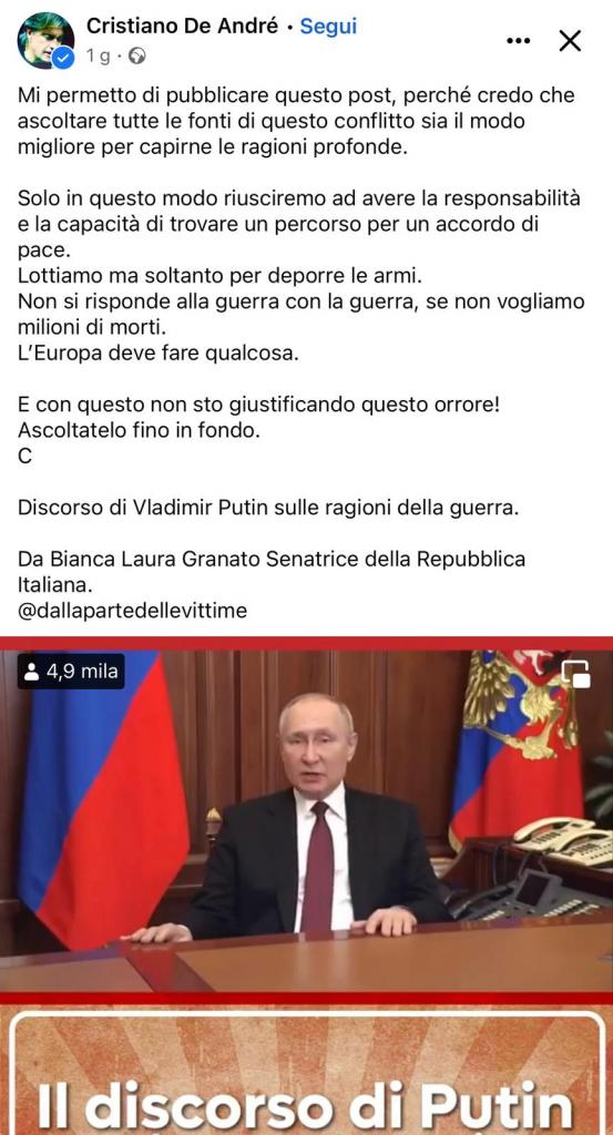 Mi permetto di pubblicare questo post, perché credo che ascoltare tutte le fonti di questo conflitto sia il modo migliore per capirne le ragioni profonde. Solo in questo modo riusciremo ad avere la responsabilità e la capacità di trovare un percorso per un accordo di pace. Lottiamo ma soltanto per deporre le armi. Non si risponde alla guerra con la guerra, se non vogliamo milioni di morti. L’Europa deve fare qualcosa. E con questo non sto giustificando questo orrore! Ascoltatelo fino in fondo. C Discorso di Vladimir Putin sulle ragioni della guerra.