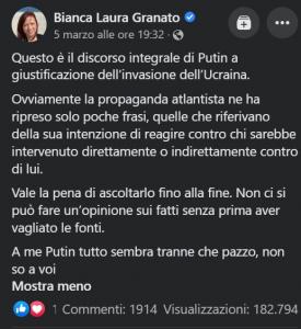 La prima cosa da segnalare è che il discorso di Putin con la grafica di Bianca viene condiviso da svariate pagine in una versione da dieci minuti, versione che non è “il discorso di Putin” ma un suo adattamento evidentemente riveduto e accorciato, l’originale è di 28 minuti. Poi ci terrei a precisare che non è stata applicata nessuna “censura americana”, il discorso è lungo, e alcune testate l’hanno appunto ridotto ai punti salienti. Ma sia da noi che negli States la versione completa circola dal 21 febbraio. Quindi la nostra senatrice ha detto una bufala.