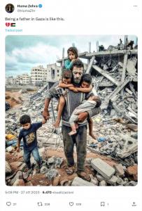 La prima è un’immagine che circola dal 27 ottobre, immagine condivisa da sostenitori della causa palestinese. Nel caso specifico si tratta di Huma Zehra, pakistana con oltre 30mila follower su X (Twitter). Che il 27 ottobre ha condiviso questo post: