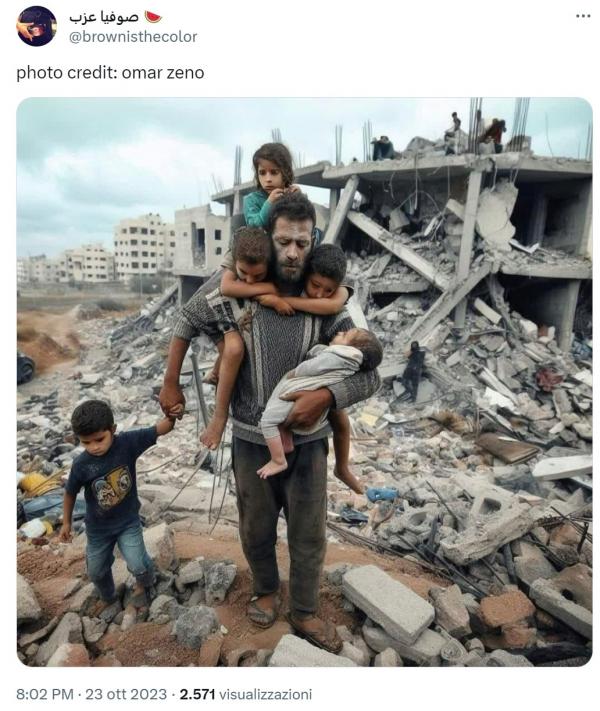 L’immagine, come riscontrato dai colleghi di BOOM, è un falso, realizzato con una AI, falso che è possibile verificare grazie a strumenti come AIOrNot.com, probabilmente generata grazie ai modelli di MidJourney. Il profilo di Huma Zehra solo nella giornata di ieri ha condiviso più di 24 post, tutti a favore del popolo palestinese, tutti composti da foto o video: impossibile verificare tutto, impossibile potersi fidare ciecamente. Addirittura su X (Twitter) l’immagine la si trova postata il 23 di ottobre, con un “photo credit” a renderla ancora più autorevole.