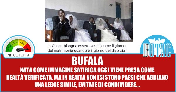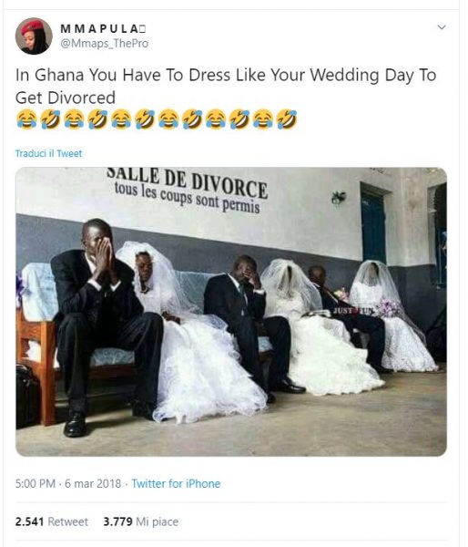 Il problema di questo montaggio è che in Ghana non ha come lingua ufficiale il francese, lo si parla, visto che i paesi limitrofi sono tutti francofoni, ma non è la lingua dello Stato: l’inglese è la lingua ufficiale, retaggio del colonialismo. La scritta in francese non ha senso. Ma in generale non esistono Paesi dove per divorziare occorre vestirsi come quando ci si è sposati. La foto circola con quel testo solo e unicamente perché ci sono persone che per un like venderebbero pure la mamma. Condividerla sull’onda della viralità è sciocco.