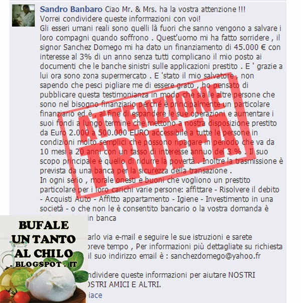 Quello che vedete nell’immagine è un profilo falso di recente creazione (in questo caso si chiama Sandro Barnbaro); l’ho beccata/o in giro per il Facebook generato dalla mia zona, si è intrufolata/o in mille gruppi aperti e ha spammato nei commenti di ogni post; è la classica offerta di prestito convenientissimo che però costa una piccola somma iniziale. Una truffa in grande stile che circola da prima dell’Internet stessa. Solo che coi tempi di crisi che abbiamo il rischio che qualcuno ci caschi è immenso.