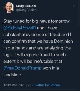 L’ultima notizia falsa che riguarda la Dominion si basa su alcuni tweet screenshottati che sembrerebbero partire dall’avvocato personale di Donald Trump Rudy Giuliani, in cui si afferma: “Stay tuned for big news tomorrow. @SidneyPowell1 and I have substantial evidence of fraud and I can confirm that we have Dominion in our hands and are analyzing the logs. It will expose fraud to such extent it will be irrefutable that @realDonaldTrump won in a landslide”. (Restate sintonizzati per delle grandi notizie domani. Sidney Powell e io abbiamo prove sostanziali di frode e posso confermare che abbiamo Dominion nelle nostre mani e che stiamo analizzando i registri. Questo esporrà le frodi a tal punto che sarà inconfutabile come Donald Trump abbia vinto in maniera schiacciante).