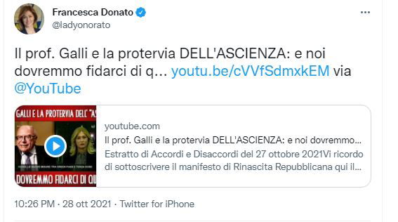 Nell’ennesimo programma televisivo che campa grazie agli ospiti in costante disaccordo (robaccia che andrebbe fatta sparire dai palinsesti, in particolare durante un’emergenza sanitaria) è stata ospite negli scorsi giorni Francesca “LadyOnorato” Donato. Cosa è andata a fare in televisione una politica laureata in giurisprudenza? Ovviamente a parlare di medicina, perché questa è la televisione italiana. A Francesca Donato la televisione italiana contrappone l’infettivologo Massimo Galli, perché il false balance funziona proprio così.