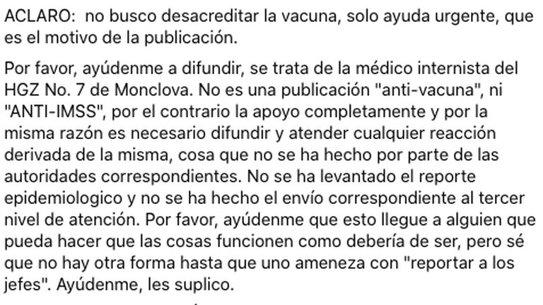 Karla Cecilia Pérez Osorio, internista presso la Clinica 7 dell’IMSS, è stata colpita da mielite trasversa causata dal vaccino anti-Covid della Pfizer che ha ricevuto a Monclova ed è ora in gravi condizioni.
