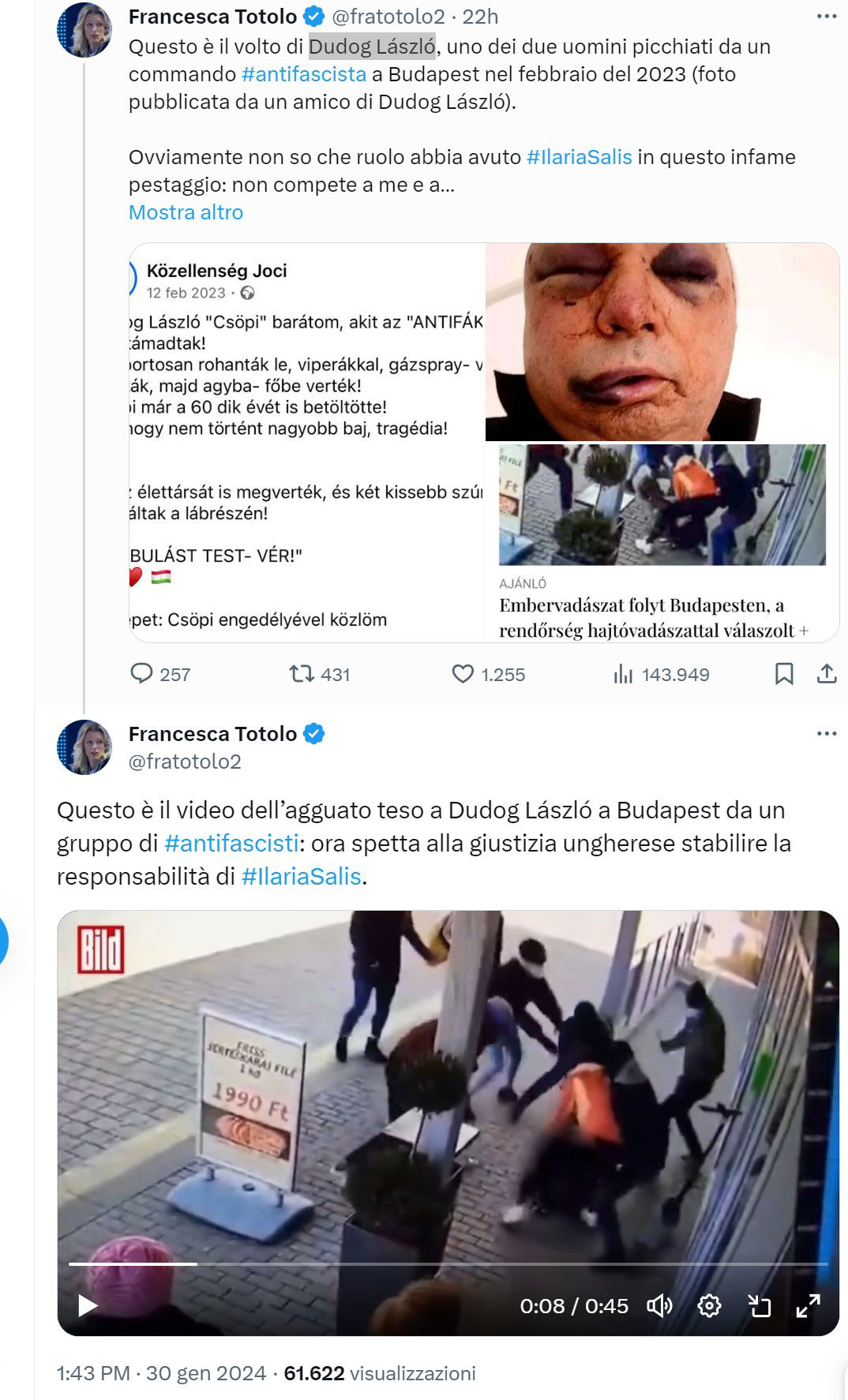 Ripeto, le aggressioni sono sempre da condannare, che siano fatte da estremisti di destra o di sinistra, la violenza non è mai una risposta giusta. Ma dare a intendere che il signor László fosse solo un semplice musicista è pura malinformazione. Se l’attivista italiana ha preso parte a questo genere di aggressioni deve essere la magistratura a verificarlo, dopo quasi un anno di carcere però le responsabilità dovrebbero essere state individuate. Ci teniamo a precisare che anche dall’altra parte ci sono stati arresti, come riportato in questo editoriale di un cronista radiofonico ungherese. Cui prodest non spiegare che la vicenda di Ilaria Salis e Dudog László si inserisce in un contesto più ampio, trattando il palese antisemitismo come dettaglio trascurabile?