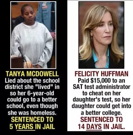 Tanya McDowell (etnia afroamericana): mentì in merito al distretto scolastico in cui “viveva” in modo che il suo bambino di 6 anni potesse andare in una scuola migliore, anche se in realtà erano senzatetto. Condannata a 5 anni di prigione.