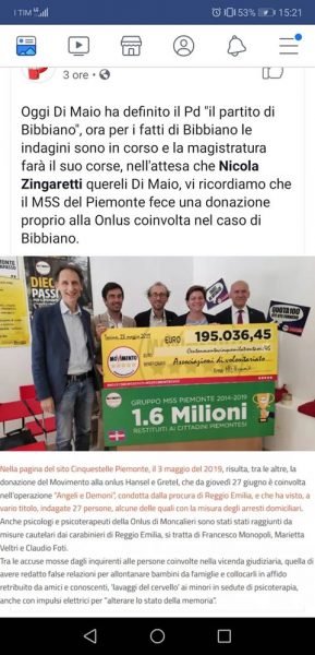 Il M5S ha donato quasi 200mila euro a 11 associazioni di volontariato tra cui la onlus Hansel e Gretel (per come avevo scritto in originale sembrava fossero andati tutti alla stessa, ho aggiornato per specificare). La donazione è stata fatta di propria iniziativa dopo selezione degli enti meritori di un aiuto economico. A fine giugno 2019, quando la storia di Bibbiano ha iniziato a prendere piede sui giornali, prima hanno chiesto i soldi indietro (non credo siano stati restituiti, non ne vedo per ora una ragione valida legalmente parlando), poi hanno deciso che la strategia di difesa migliore fosse l’attacco, in primis nei confronti di un altro partito a cui appartiene il sindaco, indagato però per fatti che riguardano illeciti amministrativi non direttamente collegati agli affidi sospetti.